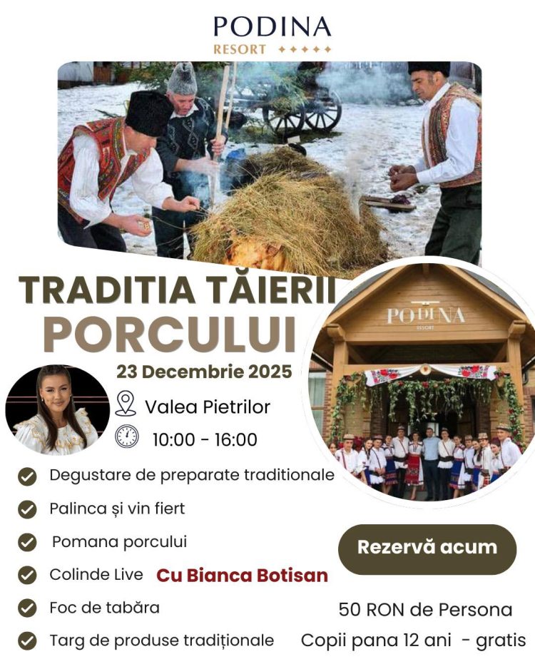 Pe 23 decembrie 2025, Podina Resort organizează unul dintre cele mai așteptate evenimente de Crăciun, Tradiția tăierii porcului, menit să păstreze obiceiurile autentice maramureșene. Valea Pietrilor celebrează alături de comunitate acest ritual în aer liber, unde participanții vor avea parte de preparate tradiționale și momente artistice, potrivit organizatorilor.